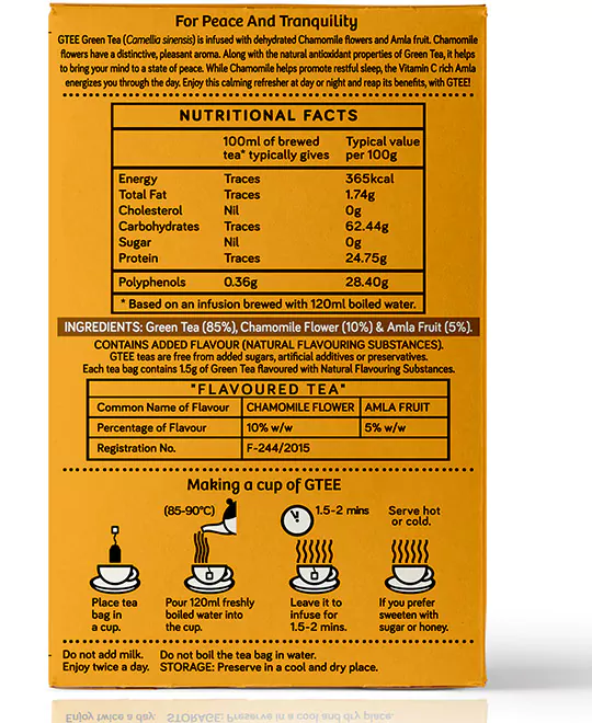 A Calming combination of Gtee is Green Tea with dried natural Chamomile Flowers and Amla Fruit. Have a break with Gtee during the day to calm your mind and by end of the day to have a restful sleep. This you really need!