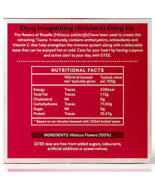 Gtee Hibiscus Herbal Infusion is made from the dried enlarged fleshy and bright red calyx of lovely Roselle (Hibiscus sabdariffa) flowers. It naurally contains Anthocyanins which exerts an attractive deep red colour to the infusion. It does not contain artificial colourants, additives or preservatives.
