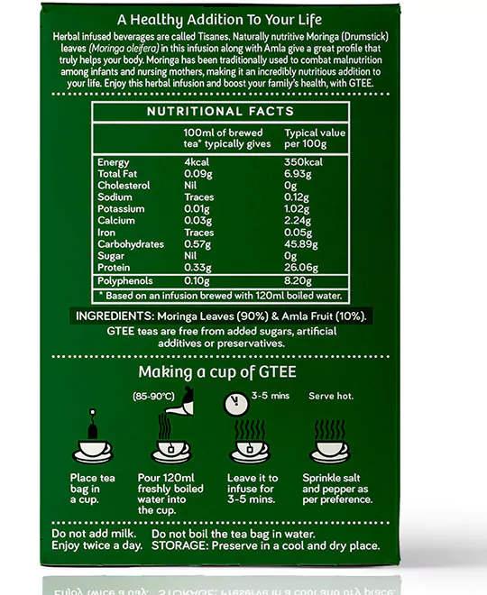 Gtee Pure Moringa (Drumstick) Leaves with dried natural Amla Fruit is always your perfect healthy choice. Try not only as a Tea but also as a soup by adding a pinch of Salt and Pepper. Gtee Moringa is now at your doorstep to care your families health.