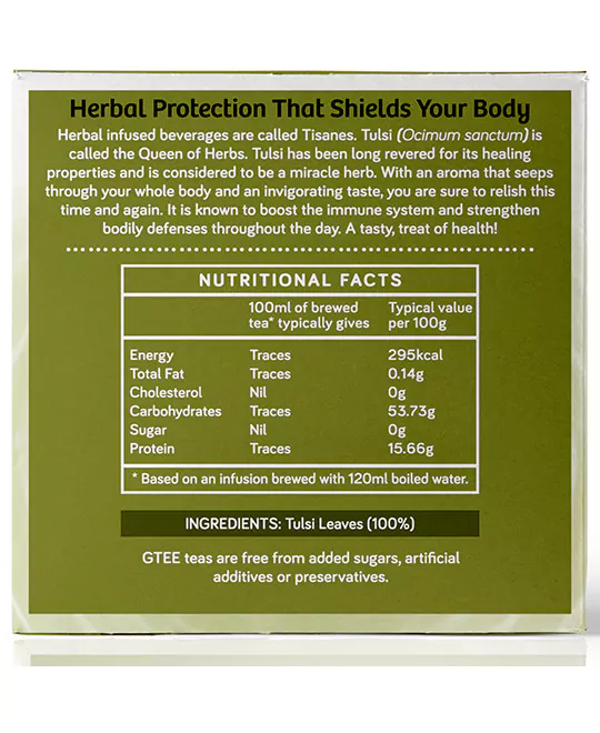 Gtee Pure Tulsi, makes you feel fresh and promotes respiratory health. Tulsi is considered to be a miracle herb. With a penetrating aroma and an invigorating taste, you are sure to relish this time. It strengthens your body to go ahead with the day. A cup of tulsi is a cup of joy!