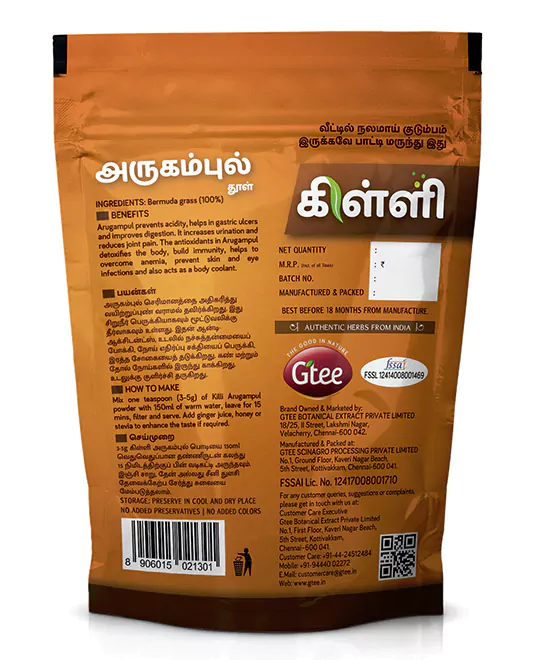 Mix one teaspoon (3-5g) of Killi Bermuda Grass powder with 150ml of warm water, leave for 15 mins, filter and serve. Add ginger juice, honey or stevia to enhance the taste if required.