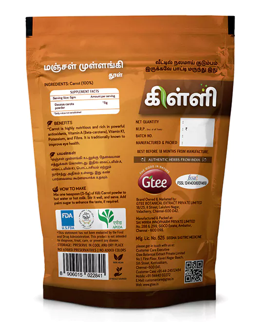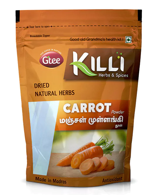 Mix one teaspoon (3-5g) of Killi Carrot powder to hot water or hot milk. Stir it well, and serve. Add palm sugar to enhance the taste, if required.
