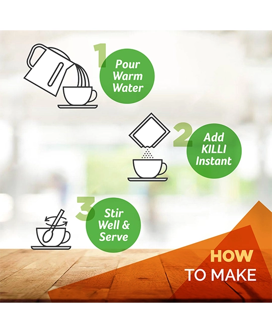 Empty the KILLI Instant Sachet into a glass of 120ml warm water or milk. Stir well and serve.