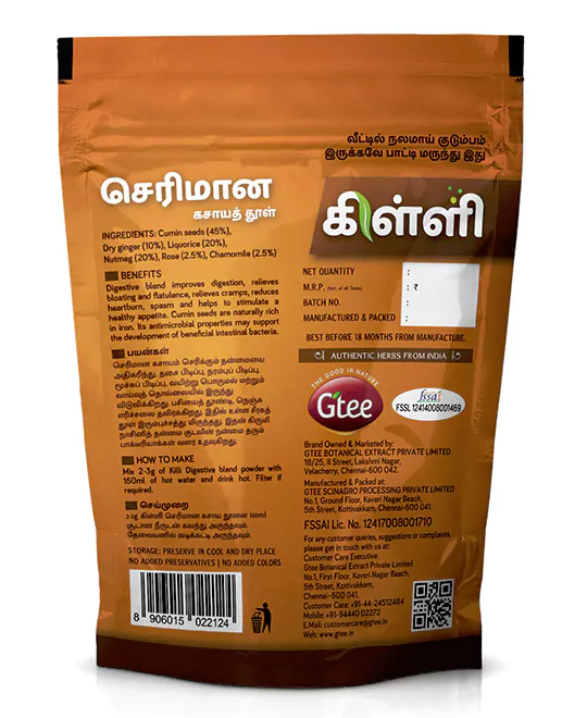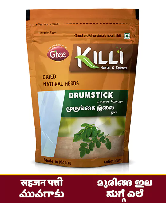 Mix one teaspoon (4-5g) of Killi Moringa leaves powder with 150ml of hot water and serve hot. It can be mixed with dosa batter. Soups can also be prepared by boiling it with vegetables. Add salt and pepper as required and serve hot.