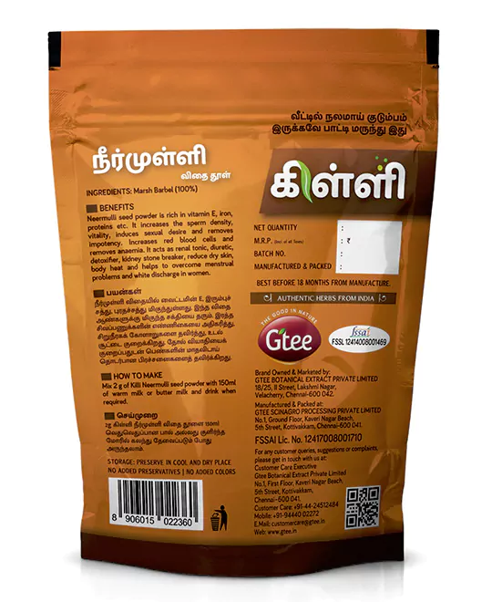 Mix 2g of Killi Neermulli seed powder with 150ml of warm milk or butter milk and drink when required.