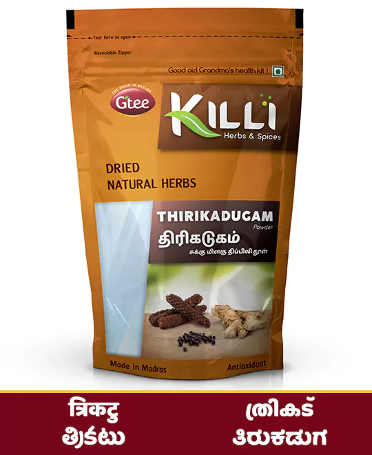 Thirikadugam has primary effect on stomach, increases digestion and regulates the overall digestive system. Removes body toxins, prevents accumulation of fat and reduces body weight. Improves immunity, relieves cold and reduces cholesterol.