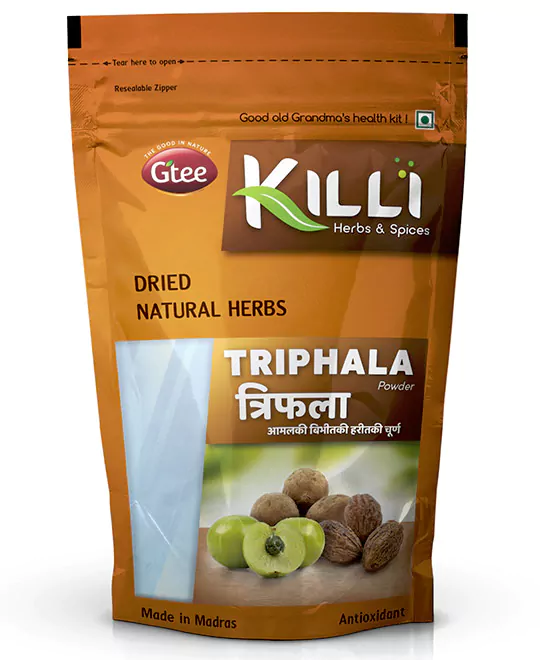 Mix one teaspoon (5g) of Killi Triphala powder with 150ml of warm water and drink daily in the night after food. Add palm sugar to enhance the taste, if required.