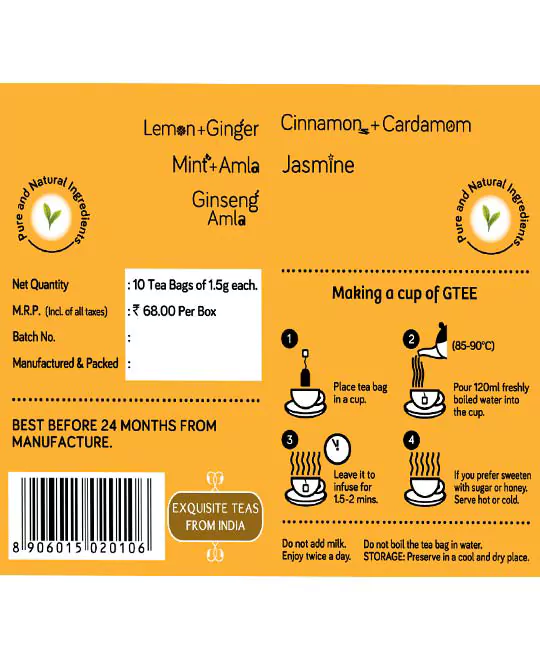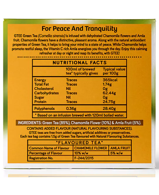 A Calming combination of Gtee is Green Tea with dried natural Chamomile Flowers and Amla Fruit. Have a break with Gtee during the day to calm your mind and by end of the day to have a restful sleep. This you really need!